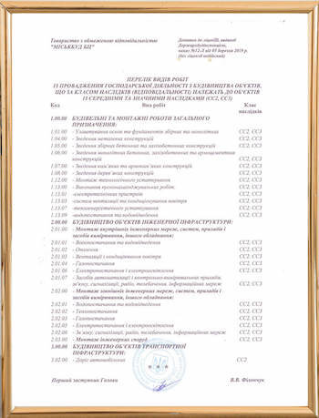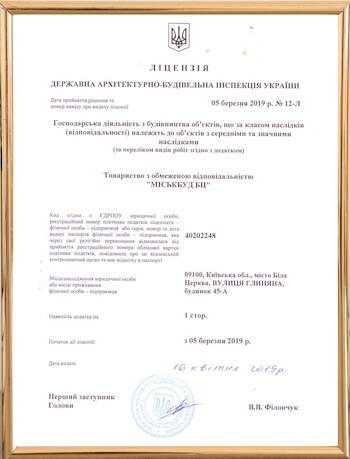 ТОВ «Міськбуд БЦ» має ліцензію найвищого класу СС3, що дозволяє виконувати будівельні роботи будь-якої складності, починаючи від приватного будівництва, до будівництва багатоповерхових будівель і комерційних приміщень.